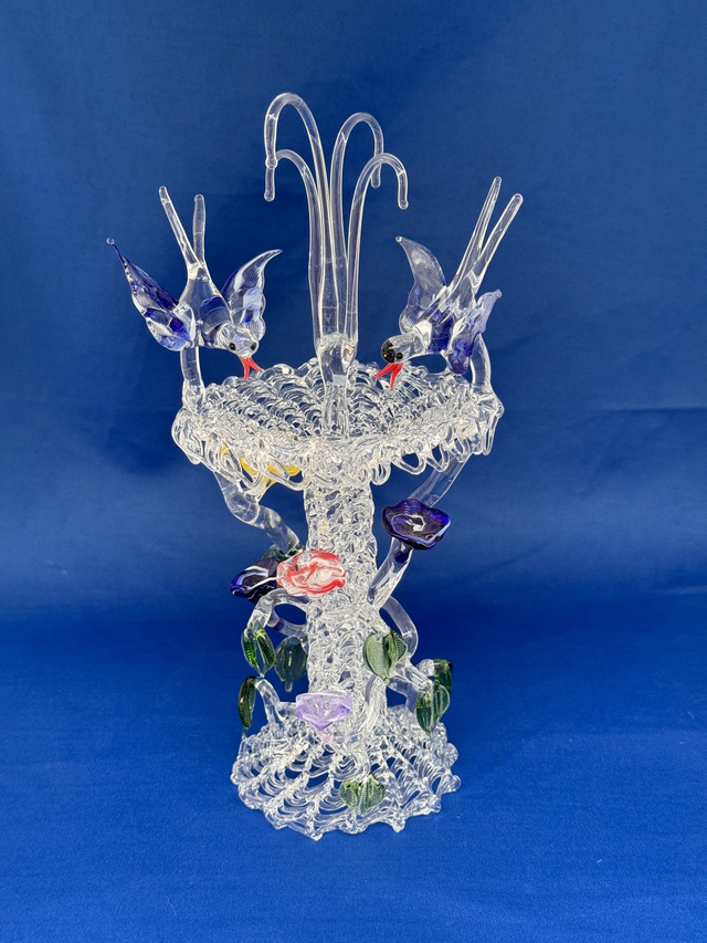 Large birdbath with birds and waterfall with flowers and vine all knitted on a spun base